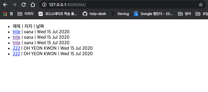 <!DOCTYPE html> <html lang="en"> <head> <meta charset="UTF-8"> <title>list</title> </head> <body> <ul> <li>제목 | 저자 | 날짜</li> {% for article in articleList %} <li><a href="/view/{{article.id}}">{{ article.title }}</a> | {{ article.name }} | {{ article.cdate|date:"D d M Y" }}</li> {% endfor %} </ul> </body> </html>templates > view