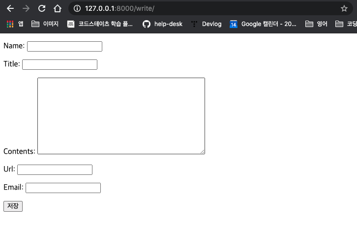 <!DOCTYPE html> <html lang="en"> <head> <meta charset="UTF-8"> <title>write</title> </head> <body> <form action="" method="post"> <!-- {% comment %} {{ form.as_table }} {{ form.as_p }} {{ form.as_ul }} {% endcomment %} --> {{ form.as_p }} {% csrf_token %} <button type="submit" class="btn btn-primary">저장</button> </form> </body> </html>templates > list