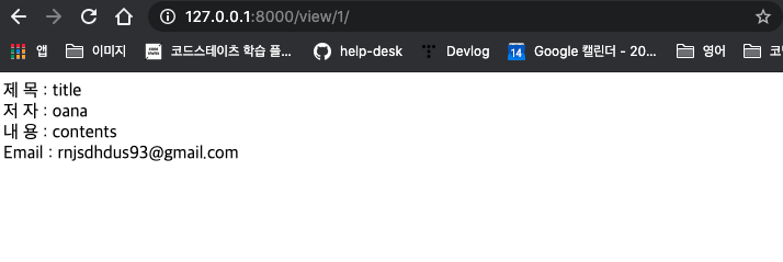 <!DOCTYPE html> <html lang="en"> <head> <meta charset="UTF-8"> <title>view</title> </head> <body> 제 목 : {{ article.title }} <br> 저 자 : {{ article.name }} <br> 내 용 : {{ article.contents }} <br> Email : {{ article.email }} <br> </body> </html>templates에서 html에 실제로 출력될 내용을 작성한다.