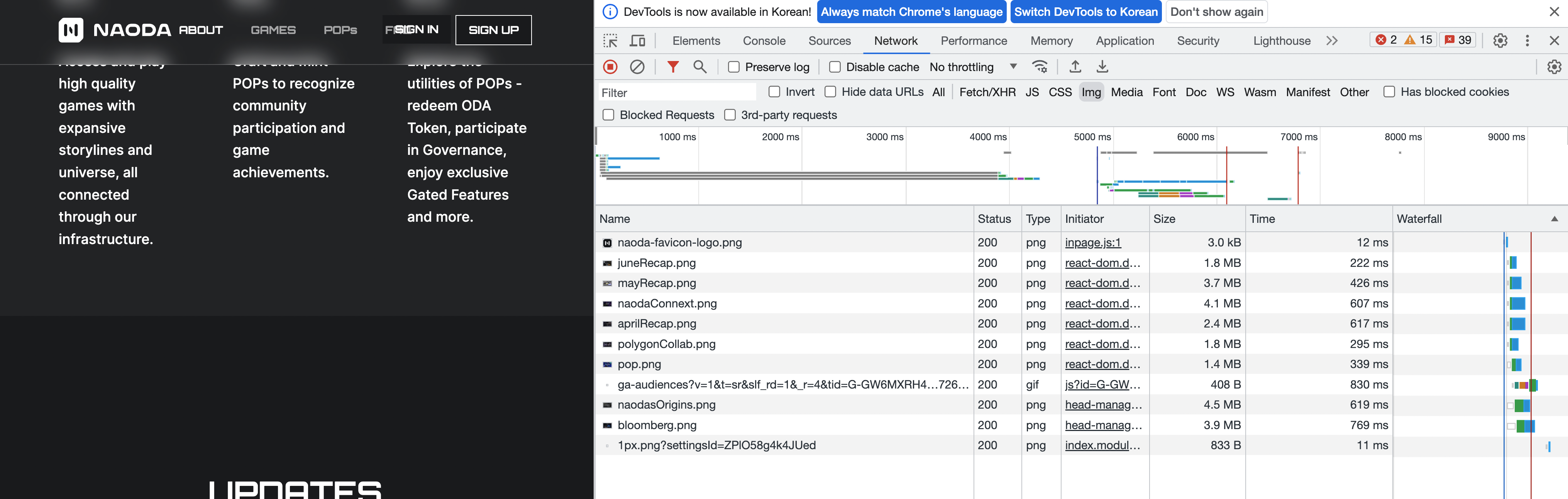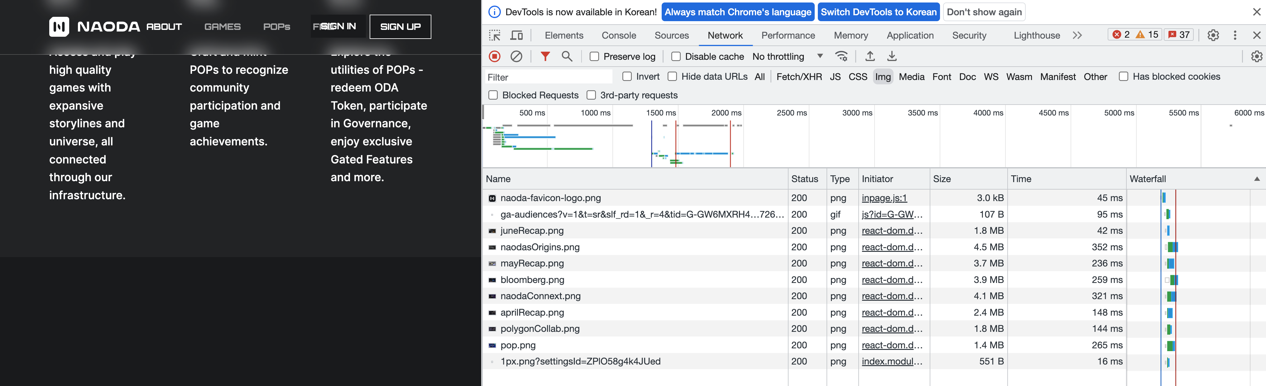 naoda-cobalt에 sharp 라이브러리 설치 후 - 큰 차이는 아니지만, 이미지 사이즈와 로딩 시간 측면에서 조금의 차이가 있는 것을 확인할 수 있음.