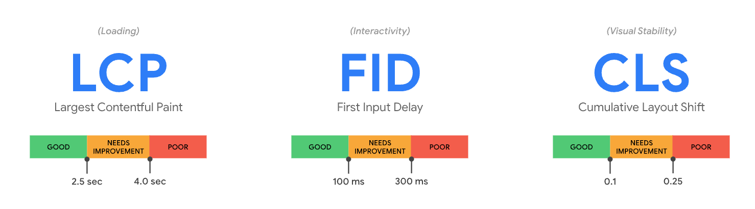 Web Vital 의 하위 집합으로 Core Web Vitals가 있는데 20년 기준으로는 UX 기준의 세 가지 측면인 1. Loading (로딩) 2. Interactivity (상호 작용) 3. Visual Stability (시각적 안정성) 에 중점을 두고 있다.