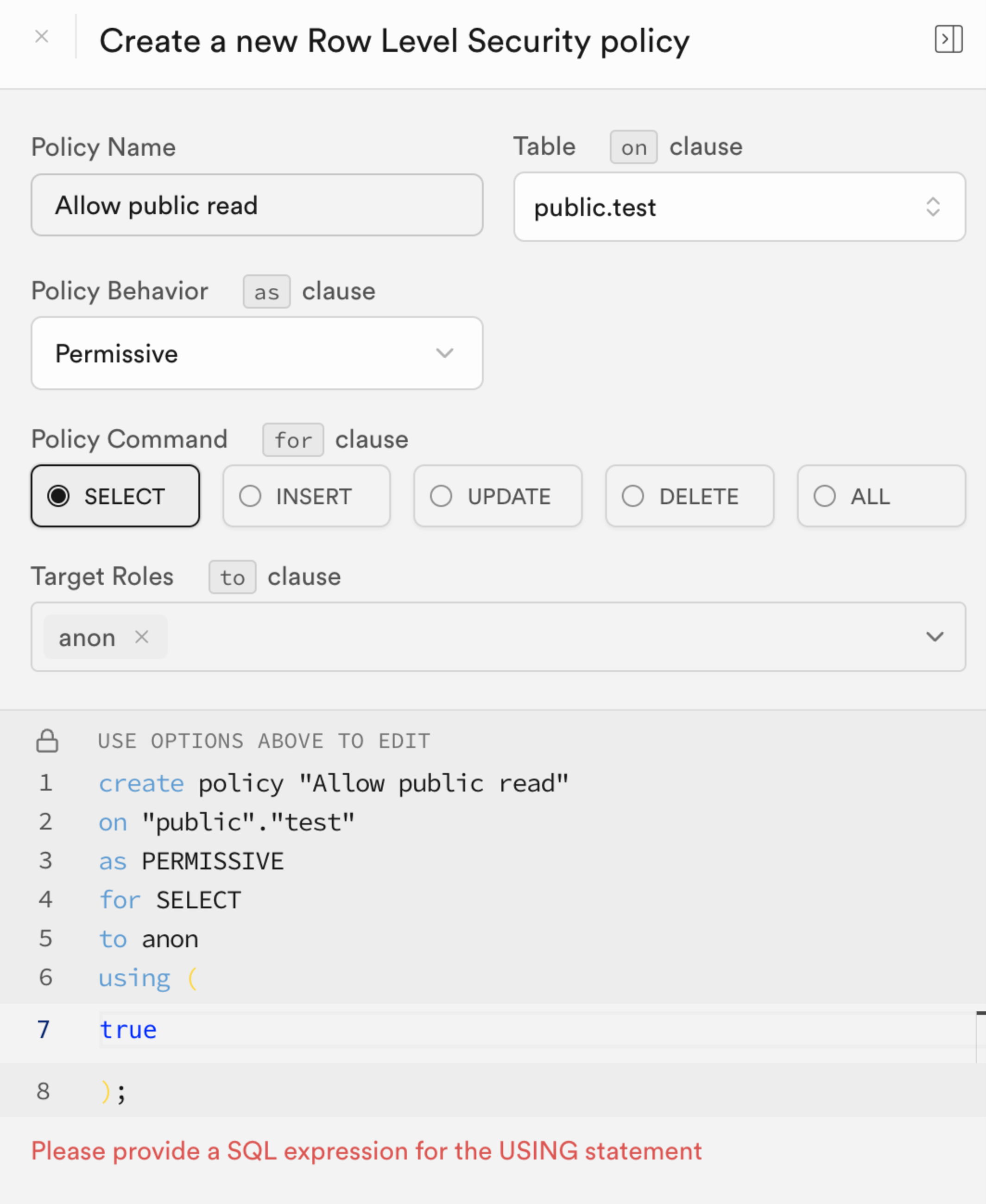 -- 모든 사용자에게 읽기 권한 부여 CREATE POLICY "Allow public read" ON your_table FOR SELECT USING (true);