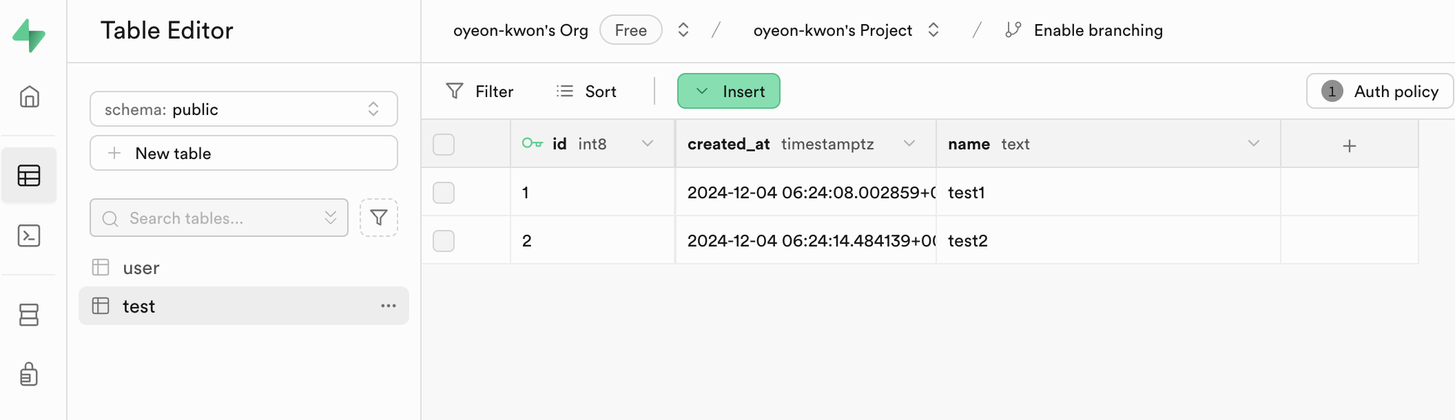 그리고 supabase 웹 사이트에서 자체적으로 테스트용 테이블들을 생성해서 row 들을 추가해 두었다.