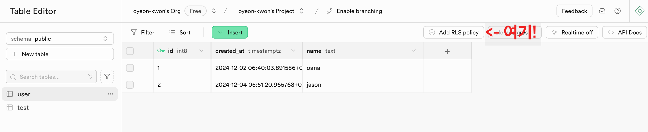 이렇게 RLS 정책을 disable 하니까 테이블 데이터 조회는 잘 됨