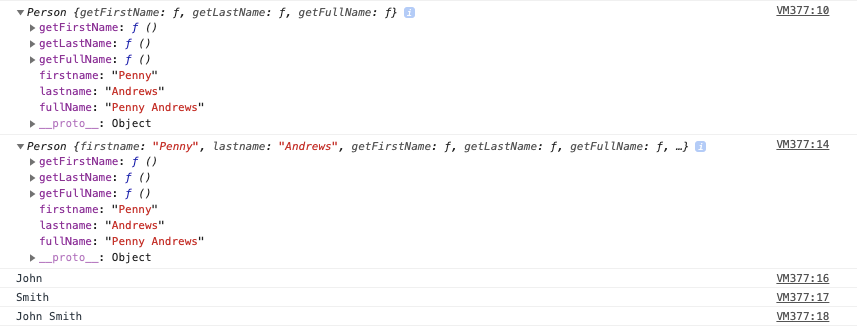 function Person(firstname, lastname) { let fullName = firstname + " " + lastname; this.getFirstName = function () { return firstname; }; this.getLastName = function () { return lastname; }; this.getFullName = function () { return fullName; }; } let aPerson = new Person ("John", "Smith"); console.log(aPerson); // --> 1번 aPerson.firstname = "Penny"; aPerson.lastname = "Andrews"; aPerson.fullName = "Penny Andrews"; console.log(aPerson); // --> 2번 console.log(aPerson.getFirstName()); // --> 3번 console.log(aPerson.getLastName()); // --> 4번 console.log(aPerson.getFullName()); // --> 5번1, 2, 3, 4, 5 번을 차례대로 콘솔 창에 찍은 결과는 이렇게 나온다.