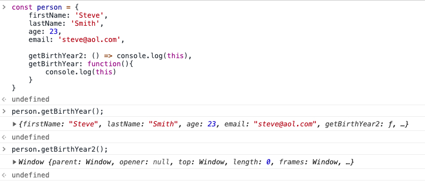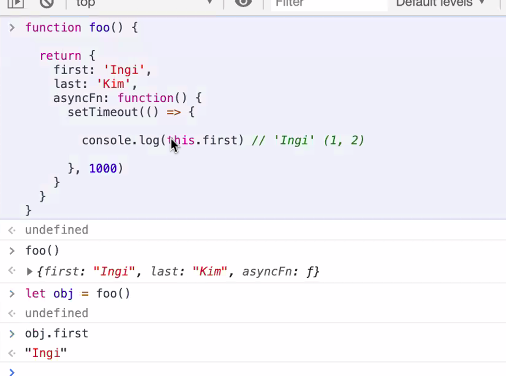 function outer() { let obj = { inner: () => { console.log(this) //outer가 어떻게 실행되는지 따라서 결정: lexical } } obj.inner(); } console.log(outer()); // windowlet foo = () => { console.log(this) } new foo() // Uncaught TypeError: foo is not a constructor foo.call({a:1}) // window위의 코드를 설명하자면