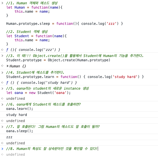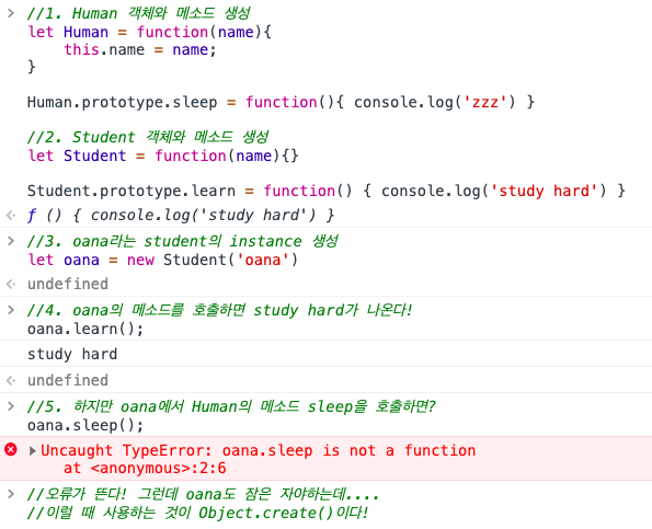 Object.create를 해주고 난 후 2번 객체에 메소드를 할당해야 제대로 작동한다는 것