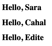 function App() { return ( <div> <Welcome name="Sara" /> <Welcome name="Cahal" /> <Welcome name="Edite" /> </div> ); }하위 component